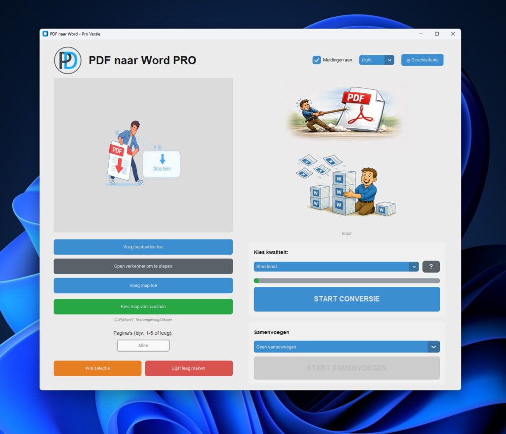 “PDF naar Word Pro tool downloaden” Een gratis tool om snel simpel PDF om te zetten naar Word. Dezelfde functies als “PDF naar Word”, maar met veel meer functies. PDF Converter Pro – Functies Starten & Afsluiten Bestanden Toevoegen Bestandsconversie Kwaliteit Kiezen Pagina’s Selecteren Samenvoegen Meldingen & Dialogen Conversiegeschiedenis Instellingen & Uiterlijk Status Updates Licentie